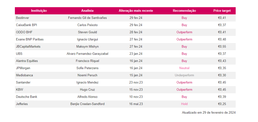 A média atual para ao ano de 2024 é de 0.40 mas existe uma divergência grande, sendo que o price target maior que é do JB Capital Markets e é também bastante mais recente é de 0,55 €