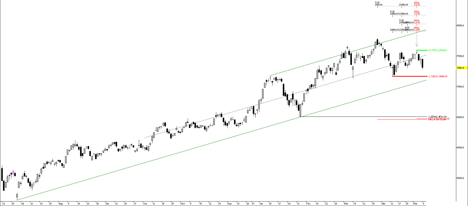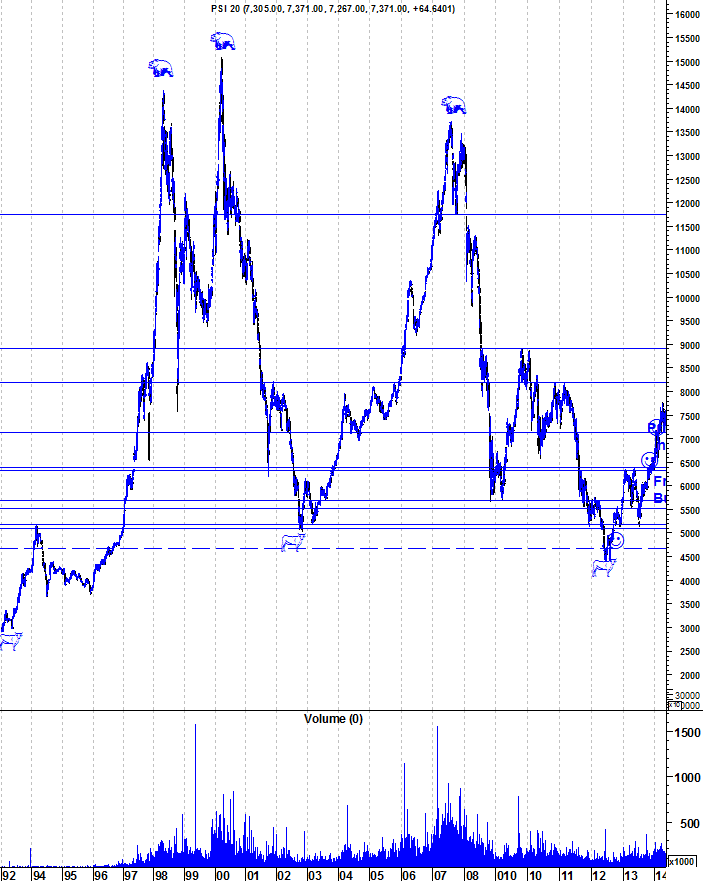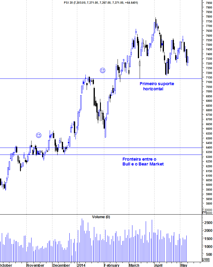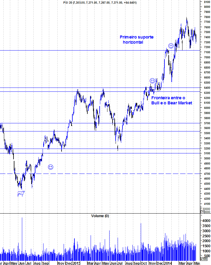 Deixo aqui os gráficos actualizados do PSI mantendo as minhas anteriores análises: Mantenho o optimismo em relação à Bolsa portuguesa que venho mantendo há 22 meses. Um primeiro sinal de fraqueza, em termos de curto e médio prazo, seria a quebra do suporte horizontal entre os 7100 e os 7150 pontos. A fronteira entre o Bear e o Bull Market está na zona crucial de suporte entre os 6300 e os 6400 pontos. Para já, apesar do marasmo dos últimos meses, nenhum dos níveis importantes foi quebrado.