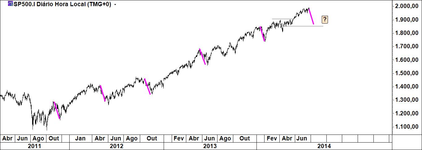 Com base no gráfico do sp500 que aqui deixo (e que também vou colocar no meu tópico, para mais facilmente encontrá-lo quando for preciso) diria que a correcção, a existir, será semelhante a correcções anteriores quer em tempo, quer em percentagem.