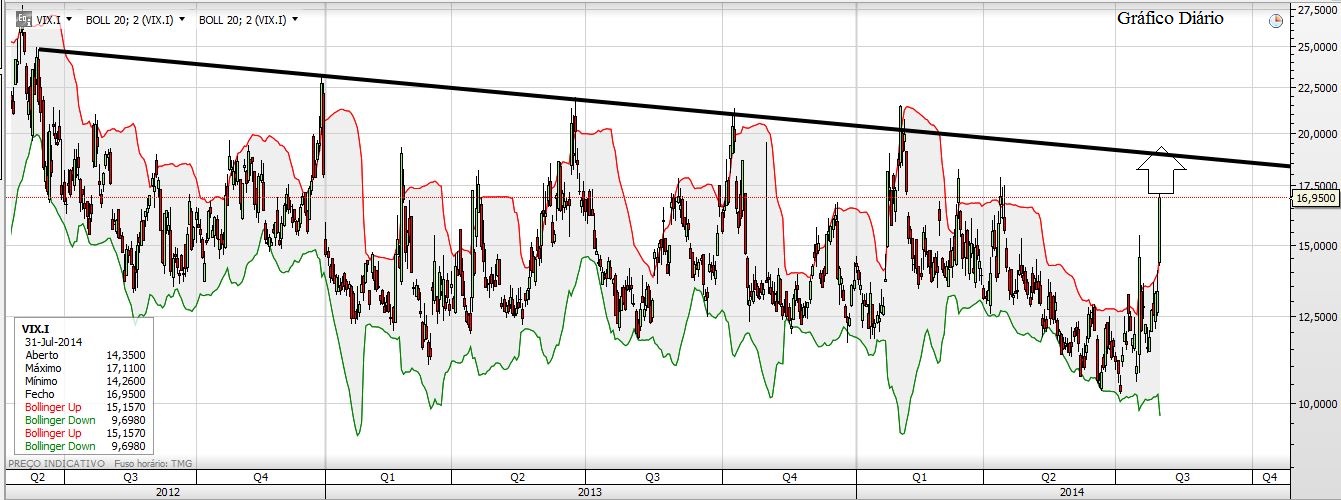 Lower highs (não se consegue ultrapassar os 2000 no S&P e distância a dilatar-se dos 17000 no DJ). S&P abaixo da linha divisoria do canal, da EMA20 e em cima da EMA50.