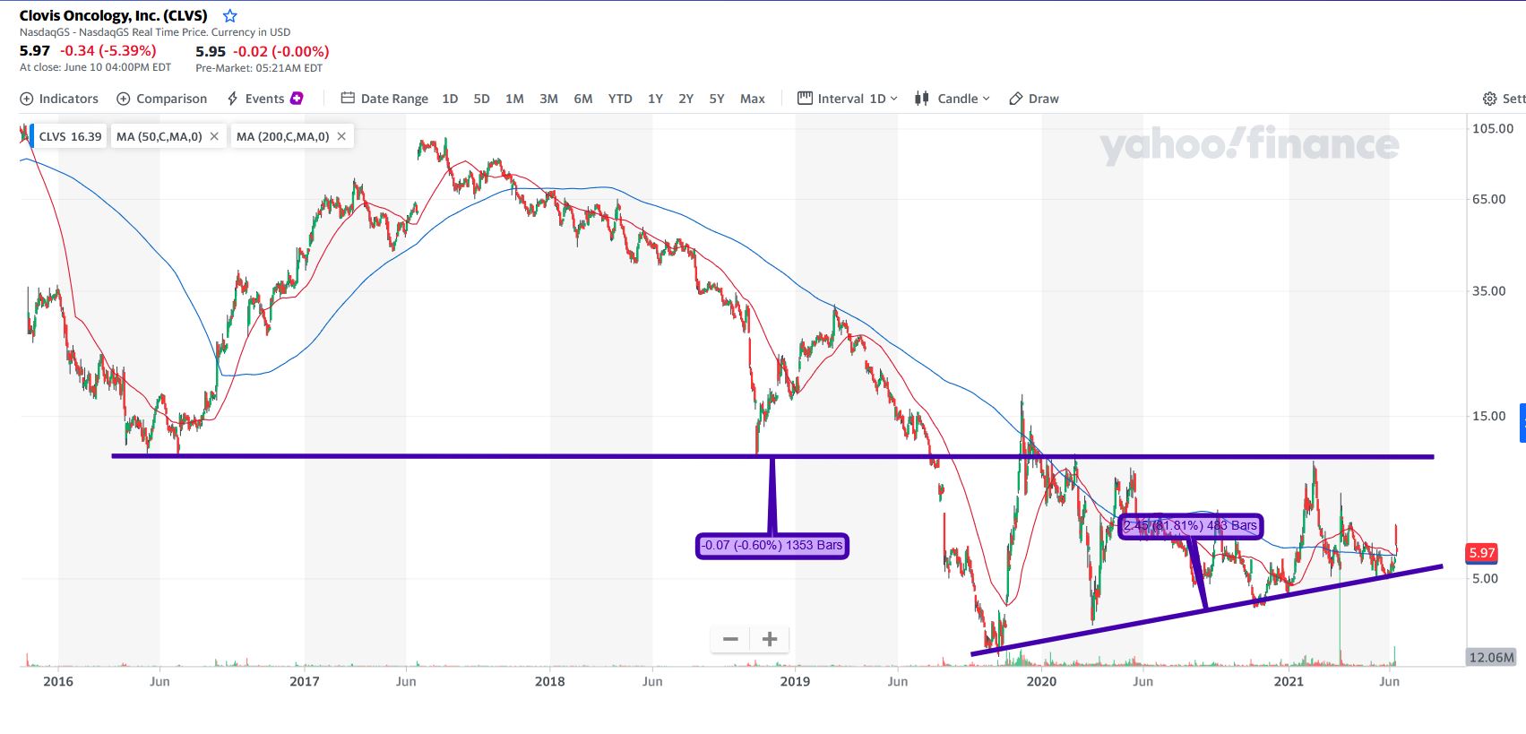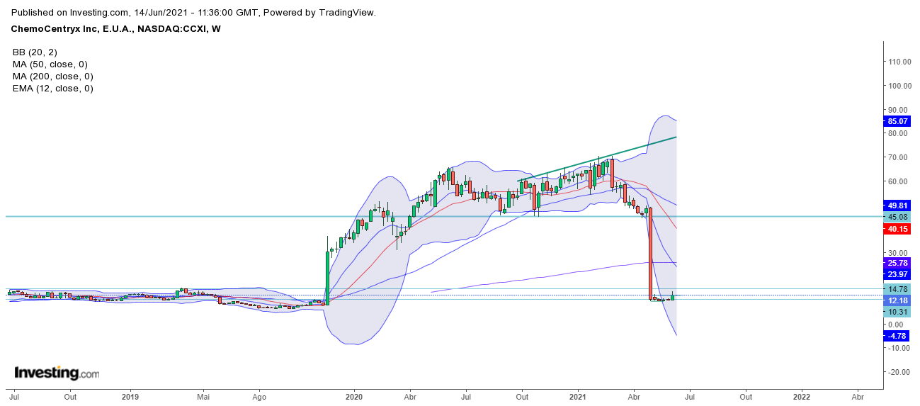 Deixo aqui também 2 sugestões, onde estou, mas diferentes. A FBIO já aqui mencionada, que está em lenta subida, depois de ter reagido bem à LTA na queda. Acho que pode duplicar o valor se o momentum se mantiver. E a CCXI, que teve uma queda Brutal, devido a um fármaco polémico, pois aguarda uma aprovação da FDA, onde o painel está dividido, mas decidirá (diz-se) até Julho....mas, como se viu a semana passada na BIIB, existe a vertente de que se um medicamente, mesmo fazendo algum mal, não existe outra solução no mercado farmacêutico, a aprovação pode acontecer. Tem um R/R muito interessante. Veio a mínimos, e pode com a aprovação subir da mesma forma que a queda. Diria com a aprovação, uns 40$-45$, sem problemas. Há quem fale em 70$100$, mas não vou por aí. No entanto o mercado, já está a antecipar a decisão positiva e começou a mexer........