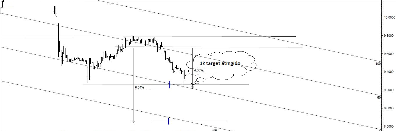 1º target atingido, stoploss acima do pivot relevante, esperando-se ida à lmlh.