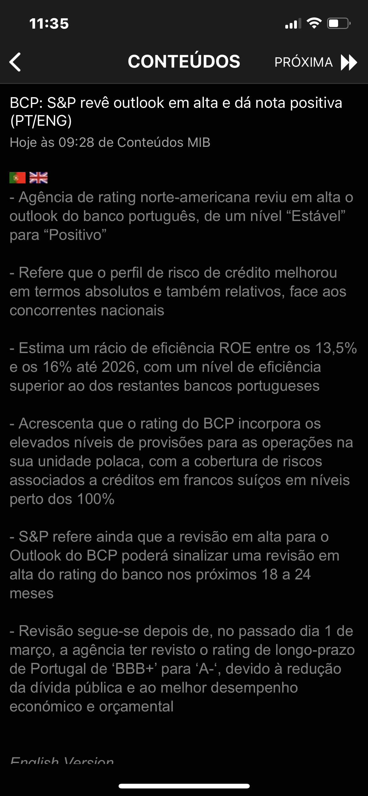 - S&P refere ainda que a revisão em alta para o Outlook do BCP poderá sinalizar uma revisão em alta do rating do banco nos próximos 18 a 24 meses