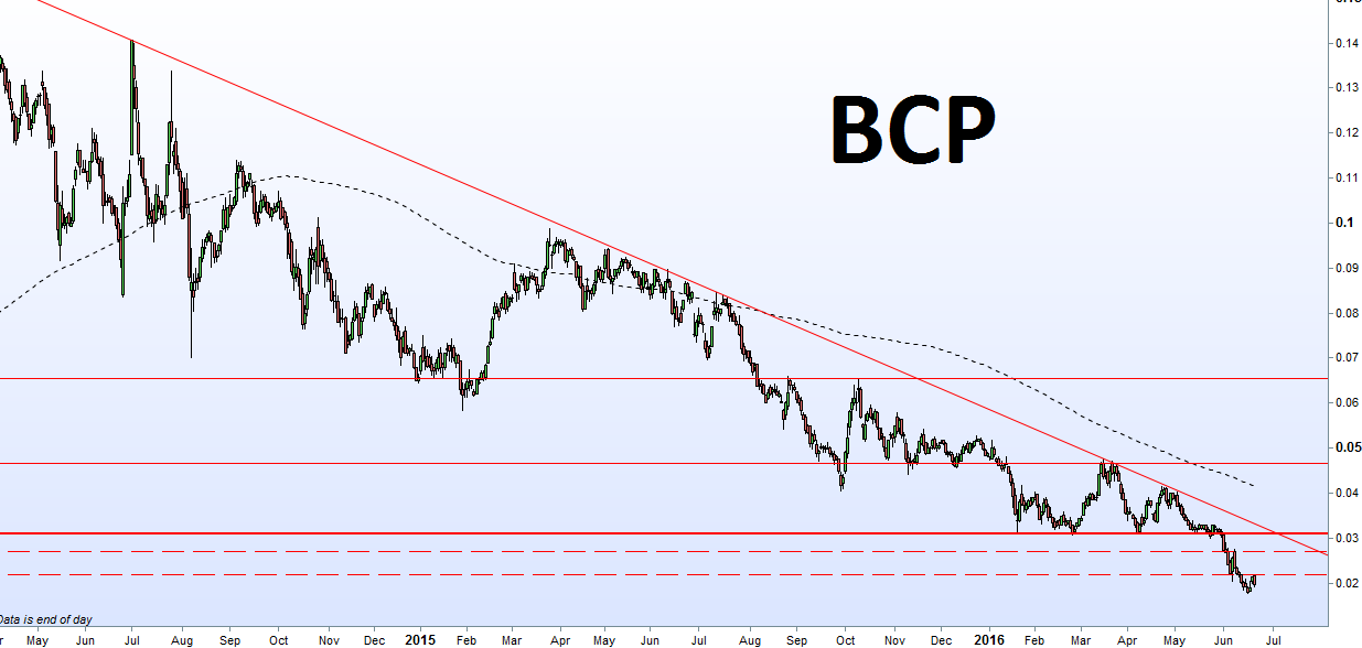 barato está ainda pode ficar mais barato .... enquanto não se acabar com a especulação dos cocos etc... os fundos short estão no poder ... não acredito que a polónia seja vendida a não ser que seja mesmo a ultima solução mas prevejo mais rapido um a.c mesmo que se desminta ... para pagar a ultima tranche caso os rácios derrapem apesar de estarem bem a gente não sabe o que vem até finais de 2017 ... se aumentarem imparidades lá terá de ser .... técnicamente são os 0.0310 como sinal atenção como 1 sinal ai talvez começe.se a pensar numa inversão de tendencia ... neste momento a probabilidade de vir aos 0.015/0.016 cada vez maior ... e facas a cair não é bom para ninguem ... quem tem posição como eu só resta aguardar pela inversão e que começe a estar no breakeven até lá não adianta comprar mais porque cada vez que se fizer a probabilidade de mais entalanço aumenta ....