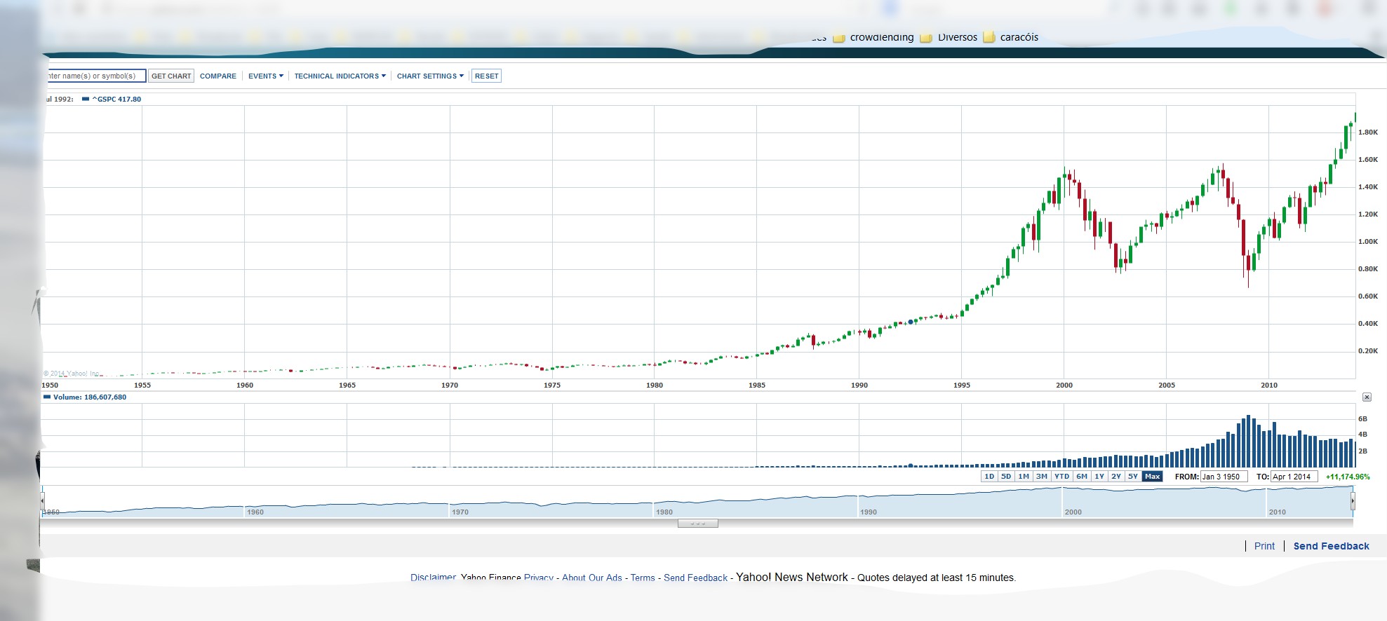Um graf desde 1950 em que cada vela são de 3 meses, onde não se vislumbra nenhum sinal de fraqueza no bull, sendo as últimas 5 velas verdinhas como os gazes do presidente do sporting