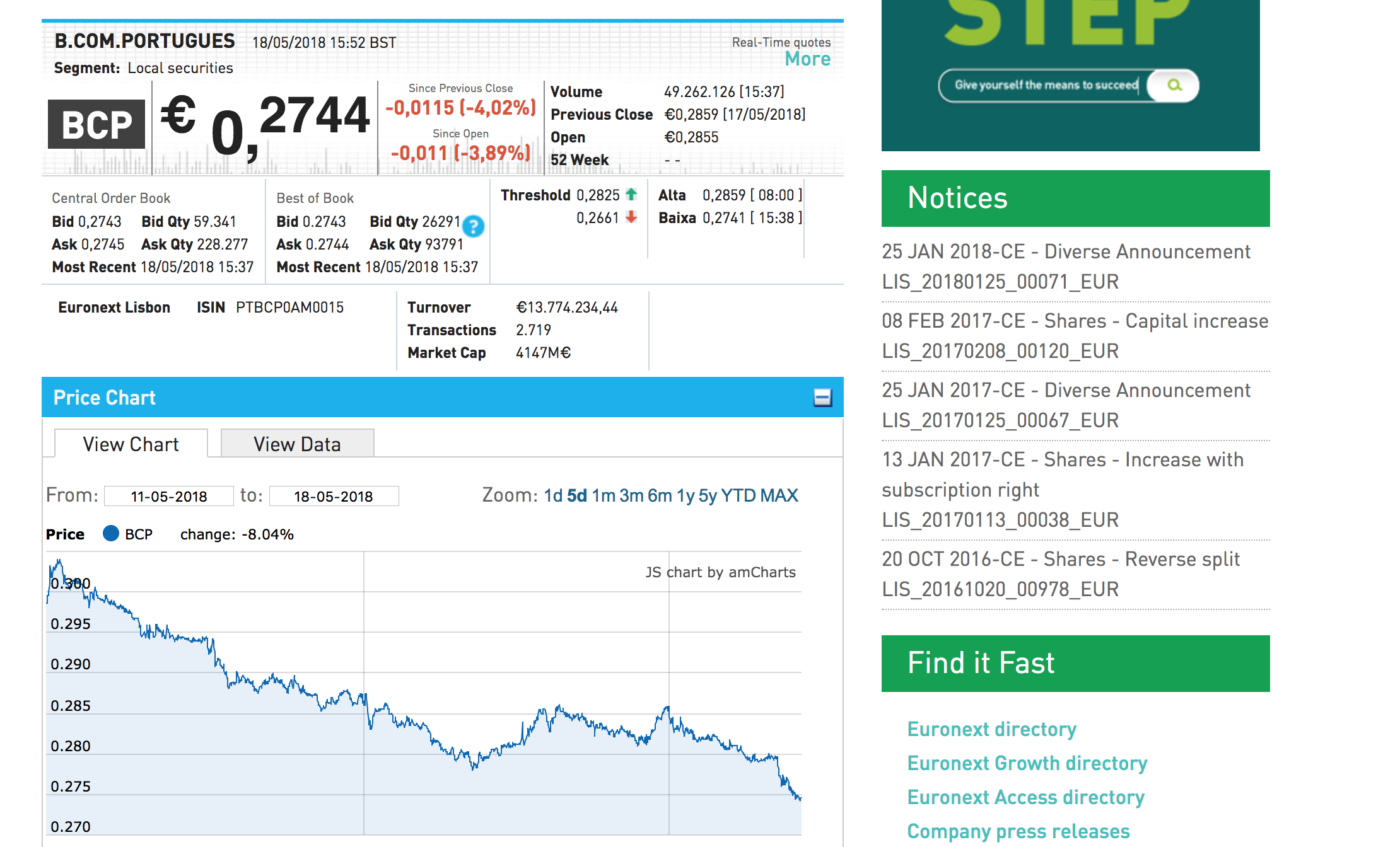 Bom dia para shorts mas este BCP está a entalar-me no pouco lucro que fiz hoje. Ainda nao vi as news mas deduzo que seja a questão política em Italia. Quase 5% num dia é obra. E com isto ja perde em relaçao ao anuncio de resultados. Como disseram zona de suporte atingida mas se segunda a situaçao em Italia nao estiver minimamente definida nao sei se este suporte nao passa a resistencia devido a quebra em baixa. Espero que recupere ainda hoje pelo.menos aos 0,2760€.