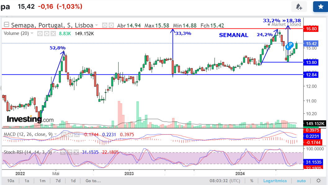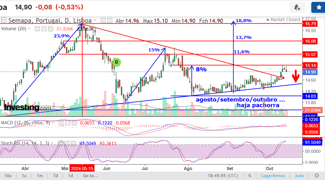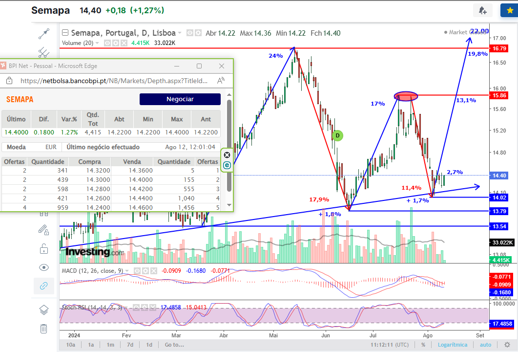 Edit: os 14,40 resistência clara em junho 22, março 23, janeiro 24. Pode agora ser o suporte.