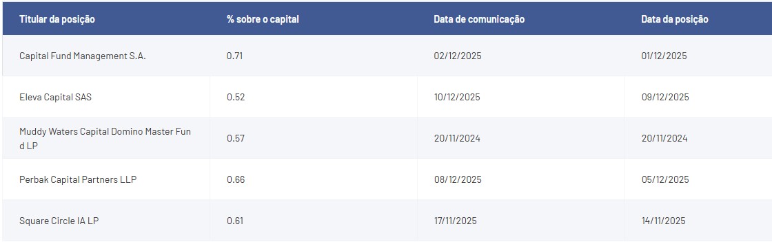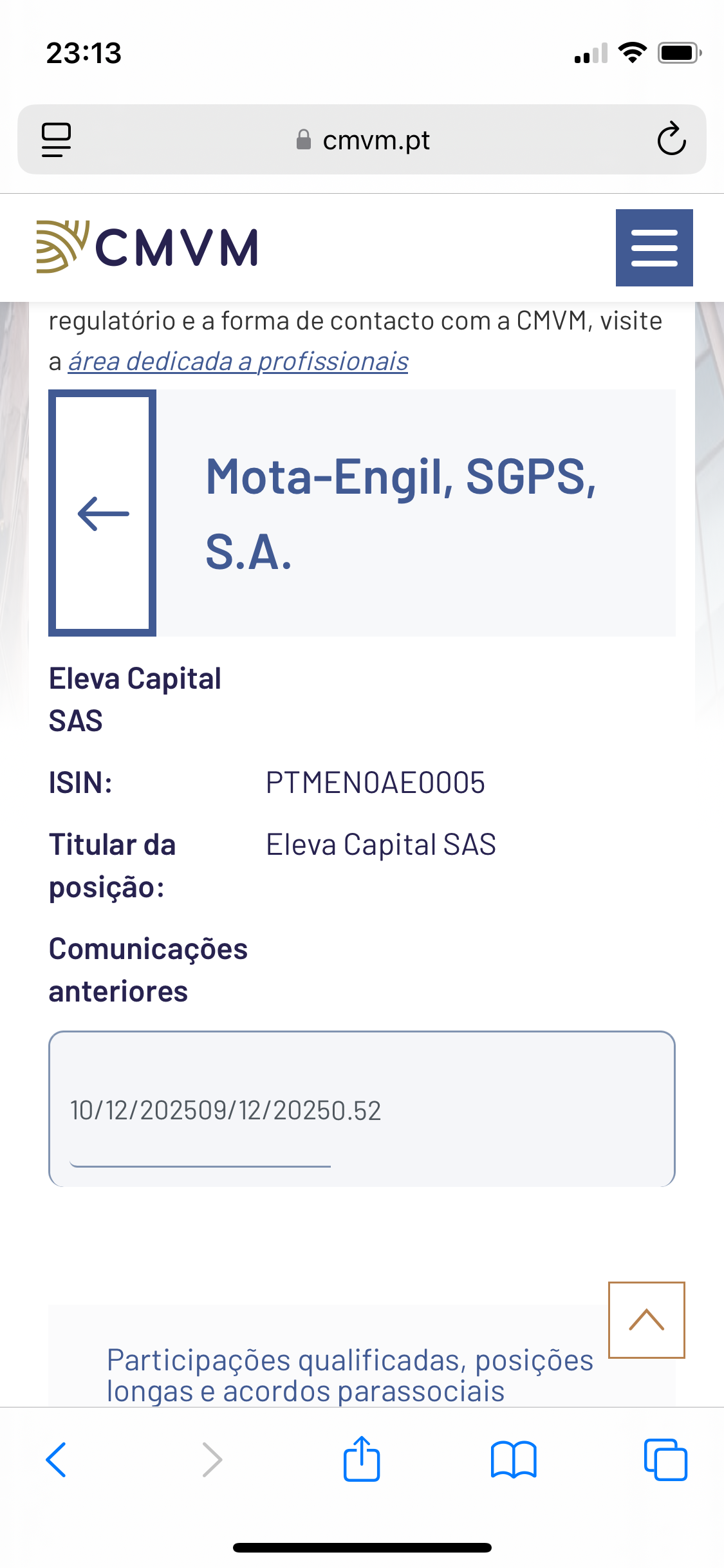 Rolling_Trader Escreveu:Ao contrário do "ataque shortista" de março a setembro de 2024, vários são os fundos que têm atualmente posição a descoberto relevante listada no site da CMVM (hoje foi comunicado mais um pela "Eleva Capital SAS" de 0.52%), o que totaliza 3.07% de curtos sobre o capital da Mota-Engil.