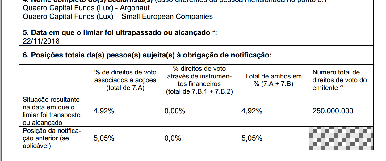 Acionista QUAERO reduz a participação na SONC abaixo dos 5% para 4.92% e poderá continuar a vender até á participação de 2% , sem ter de comunicar nada ao mercado .