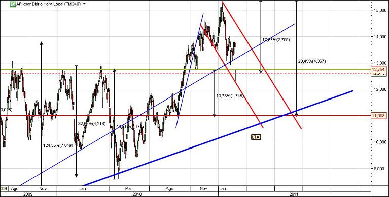 Possível canal descendente limitado pelas linhas paralelas em vermelho. Encontra a LTA pelos ~11,0 ??...