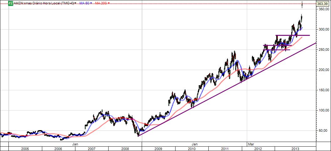 a amazon na minha opinião esta ascendente de longo prazo,está lateral de medio-curto prazo,a minha entrada curta na passada semana deveu-se sobretudo por pensar que poderia quebrar a zona de suporte dos 254-252 que se encontrava na altura e acelarar as quedas,tal não veio a verificar-se e como estamos numa tendência de longo prazo ascendente e estávamos numa zona de suporte forte entrei longo.