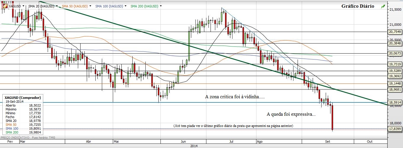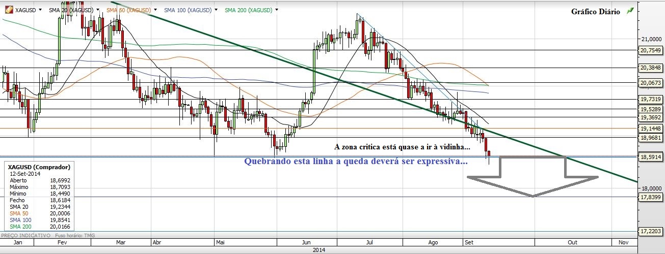 Ouro e Prata continuam o seu caminho descendente, a Prata parece mesmo estar numa queda livre que acelerou mais com a quebra do triângulo descendente. Porém, algures, tanto no Ouro como na Prata, deverá acontecer um ressalto forte, é para esse ressalto eventual que estão viradas as minhas atenções, que se traduzirão no fecho de Curtos e abertura de Longos.
