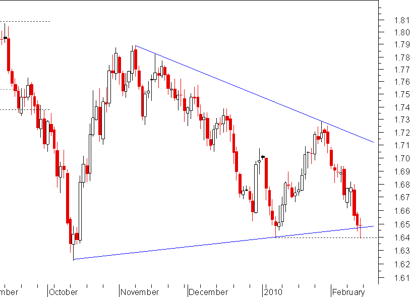 eu por acaso diria que romperá em alta... olhando assim de deslaio, está agora na onda "e". E triangulos o mais normal e' romperem no sentido da tendencia anterior e sao sobretudo nas zonas finais da tendencia por serem ondas 4 geralmente, ou ondas B.