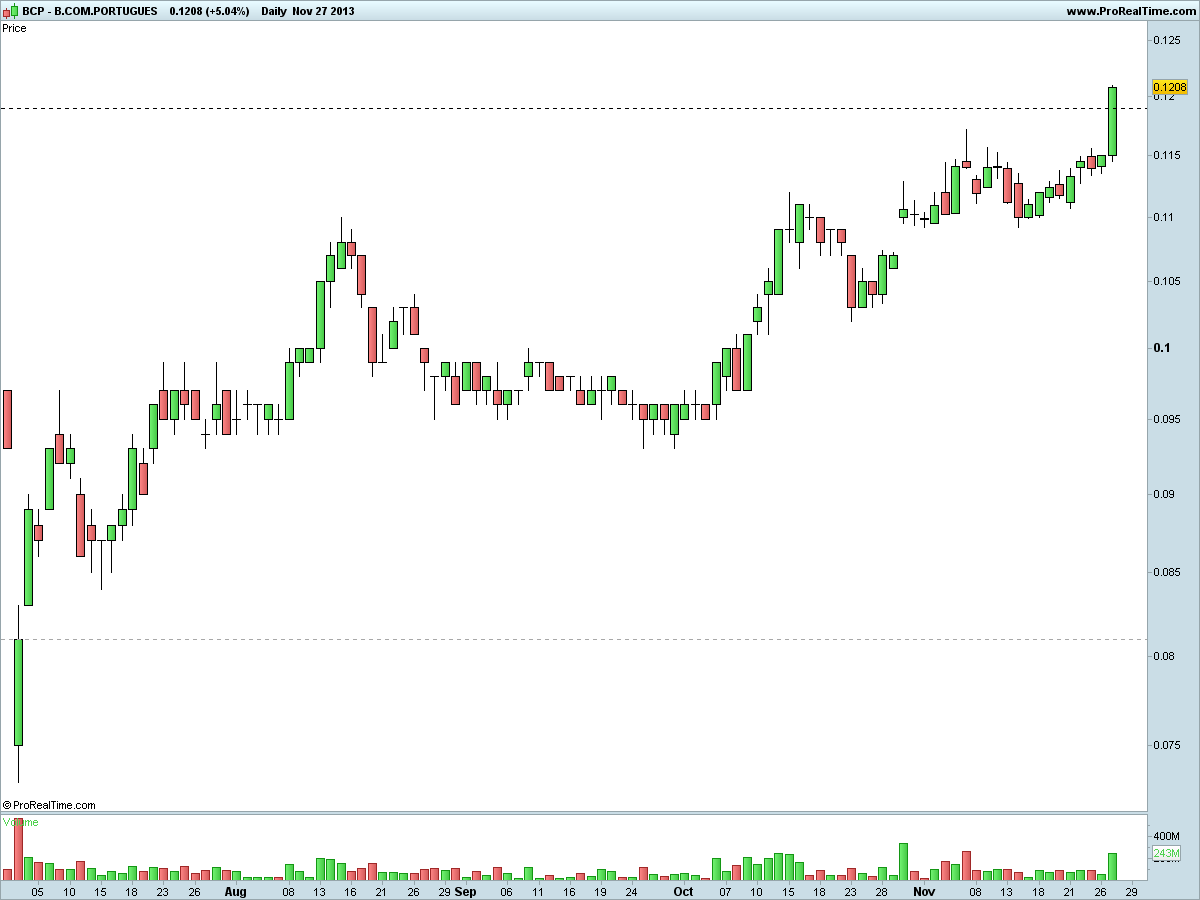 escrito em 27/11, mas mantém toda a actualidade: o banco rompeu fortemente em alta a sua fronteira para o bull marketrsacramento Escreveu:hoje o bcp deu um sinal de força, ao atacar, com volume, uma resistência da maior relevância