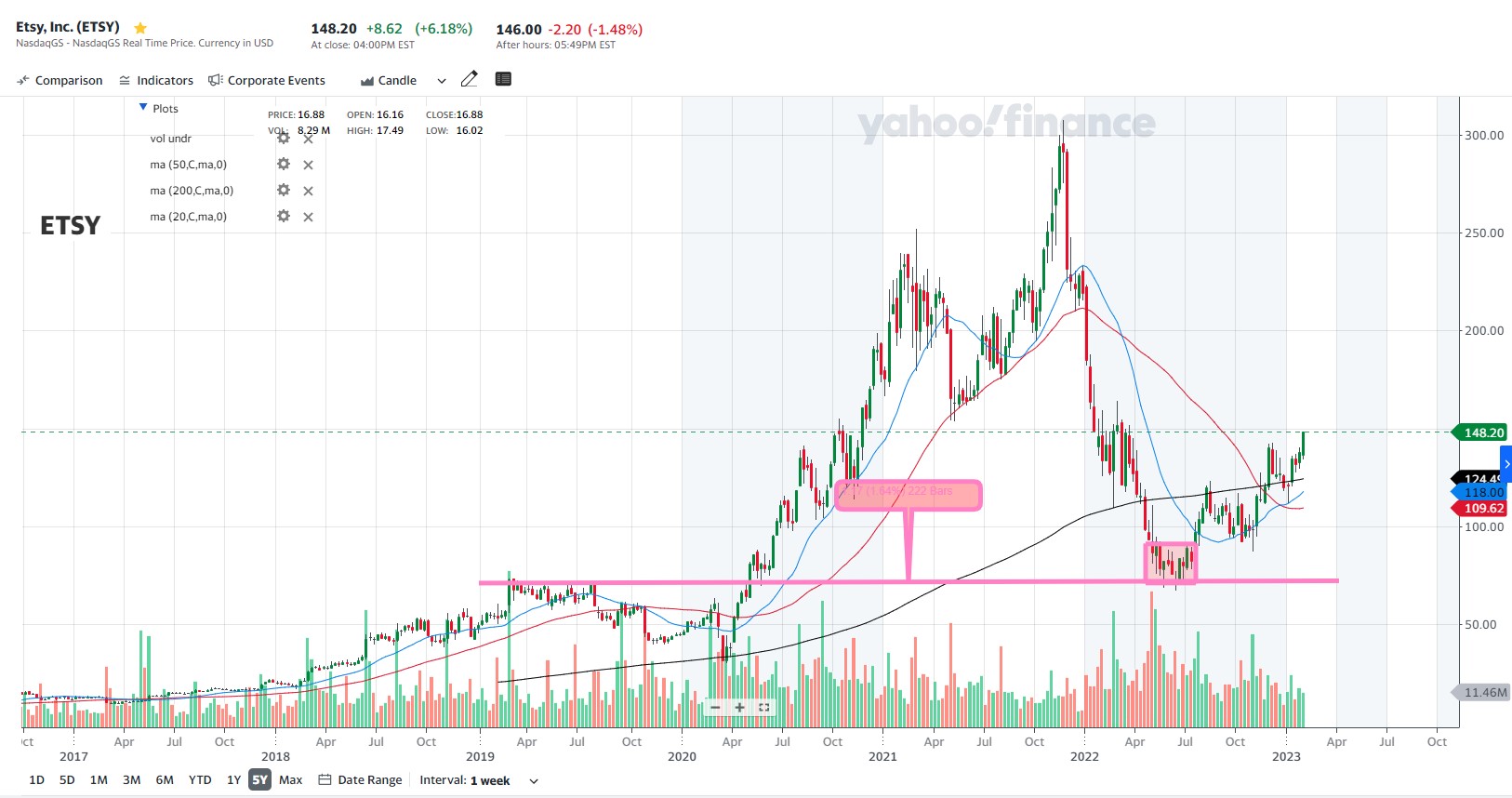 Esta é a única que não é tecnológica, é retalho, apanhada via Finviz, com sinal técnico interessante.