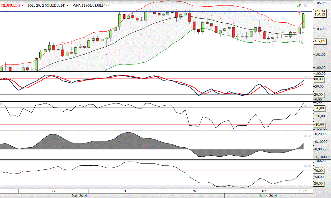 Rompeu a Banda Bollinger superior e tocou na resistência por volta dos 114,20.