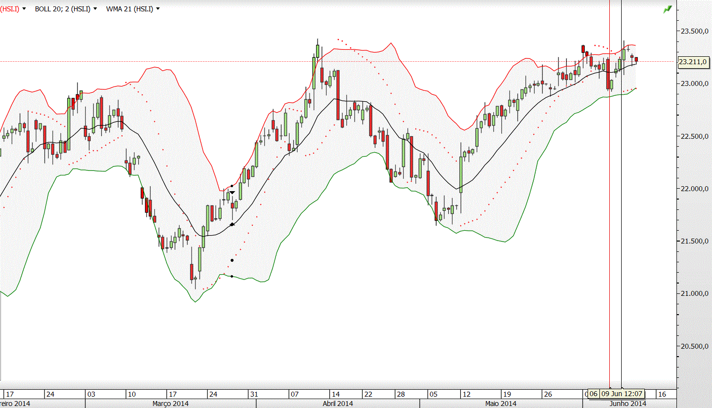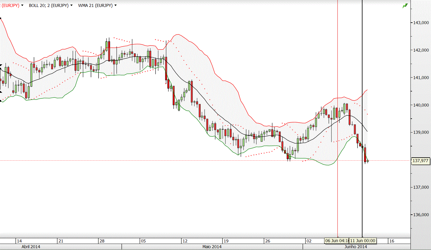 Rompimento, em baixa, da banda bollinger inferior, o que tem por consequência, normalmente, uma posterior lateralização ou subida da cotação.