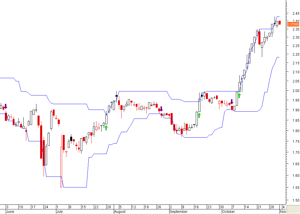 Esse sistema não dá ordens sucessivas correctas porque num momento está acima da linha superior e noutro momento pode já estar na linha inferior de modo a não deixar tomar lucro.