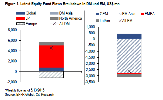 INFLOWS/OUTFLOWS Monetários por blocos – Dois dados a realçar. Graças ao fear factor Grécia, o Japão ultrapassa a Europa em novos Inflows inter regionais. A renda variável (sobretudo ações) continua a assistir a net inflows acima de 1bi semanais. A renda fixa continua o seu processo de “destruição criativa” por parte de institucionais privados (apenas suportado por compras selectivas dos bancos centrais).