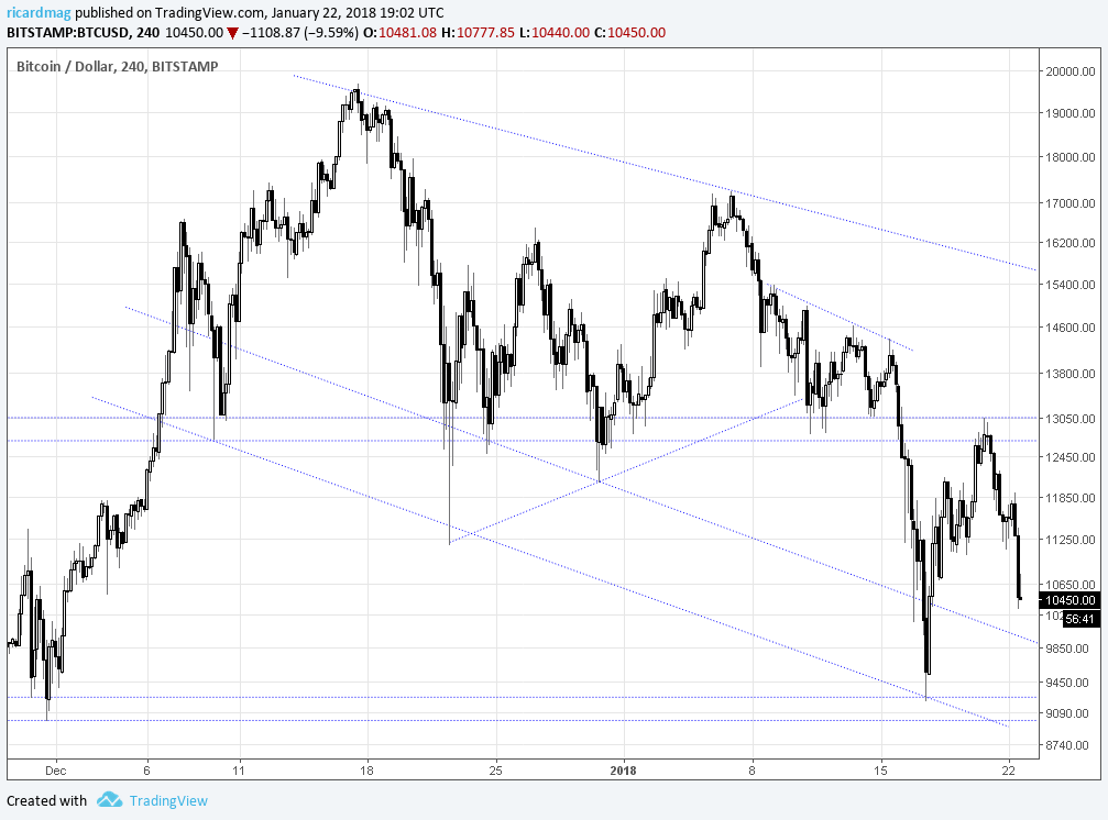 Já agora, ontem e hoje foi à zona dos 10 mil e subiu, criando a ideia para muitos que qualquer compra abaixo dos 10 mil é um bom negócio. Como sabemos, quanto mais um suporte é testado mais provável é a sua ruptura. Se estava pessimista quando escrevi o artigo a 14000, agora a 10000 estou ainda mais.