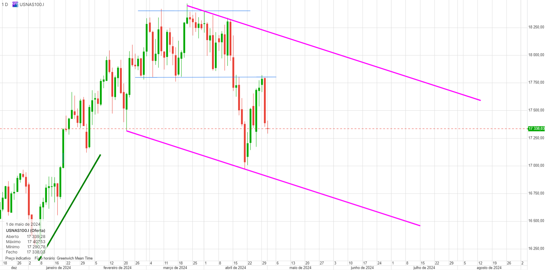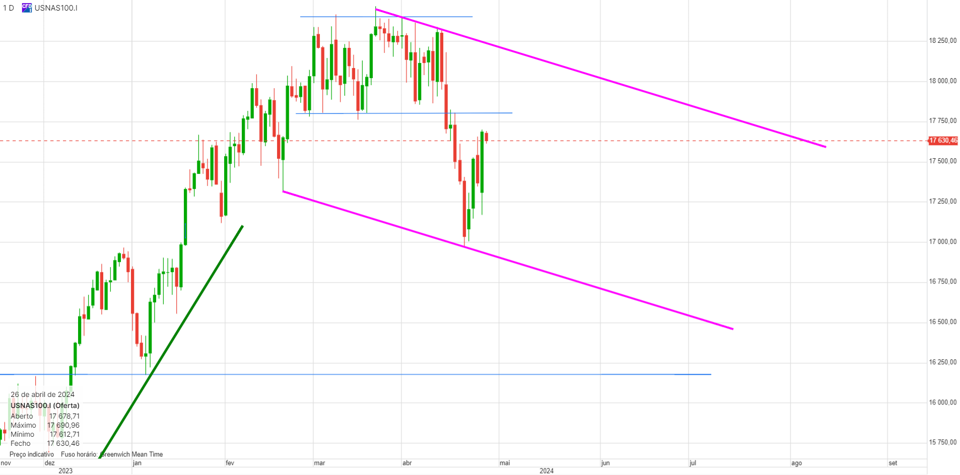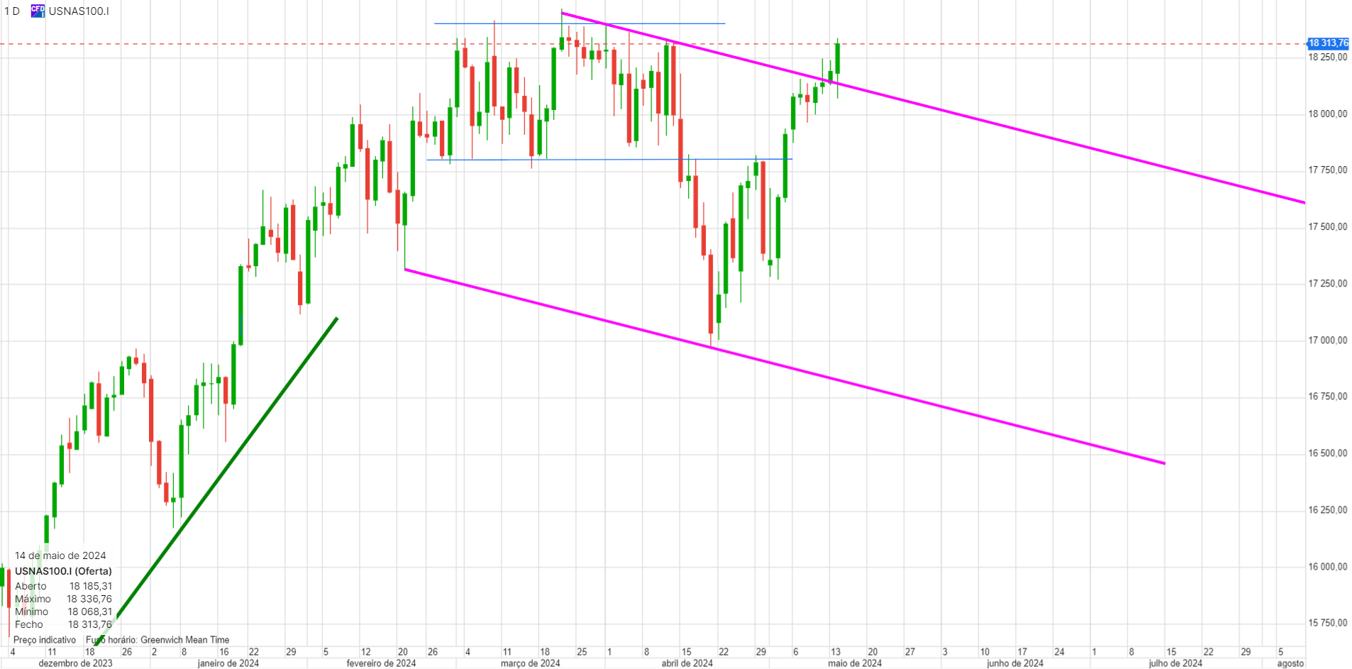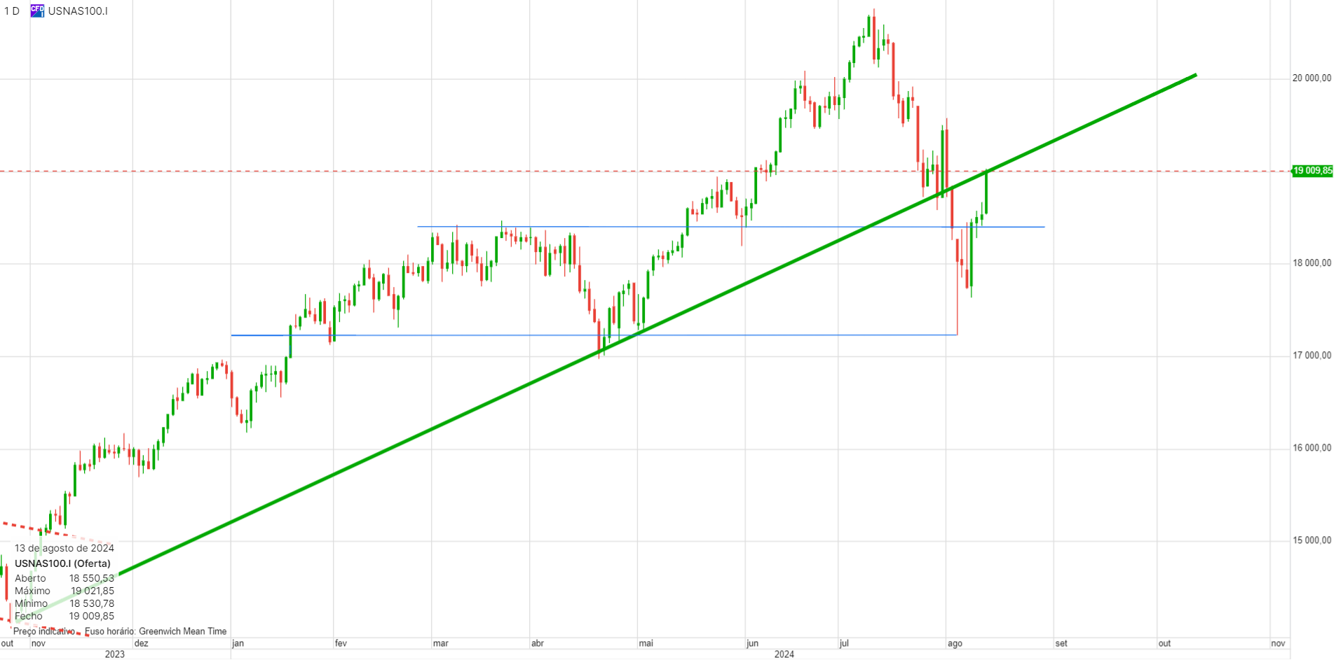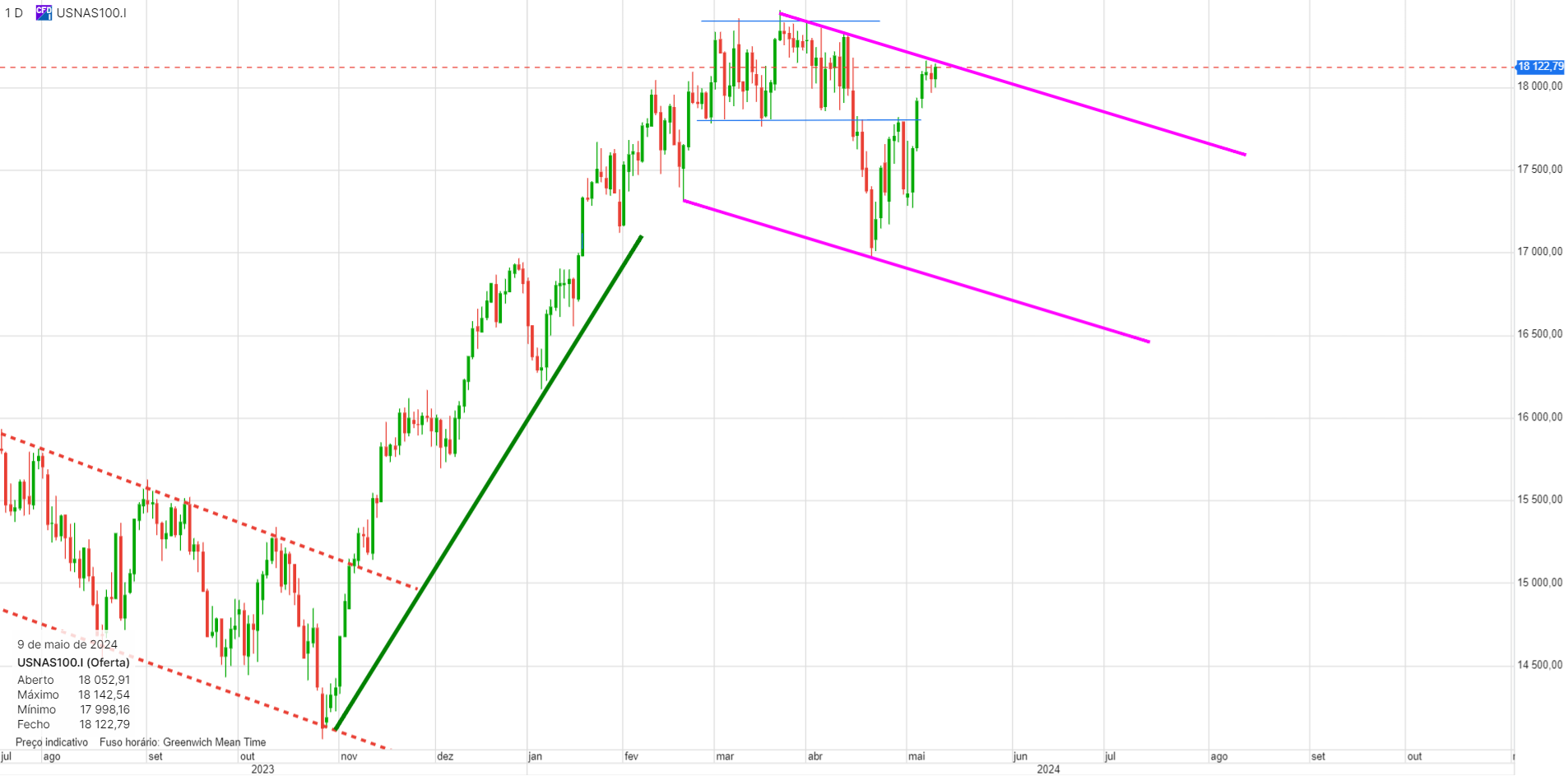 O interessante. e que eu já tinha referido, mas sem grande convicção, é que este canal descendente é uma consolidação da subida anterior, neste caso uma bandeira. Tecnicamente está perfeito, e as bandeiras acontecem frequentemente a meio do movimento, que seja em amplitude quer seja em tempo. Se assim for, isso projeta o indice para os 20000 no final de 2024.