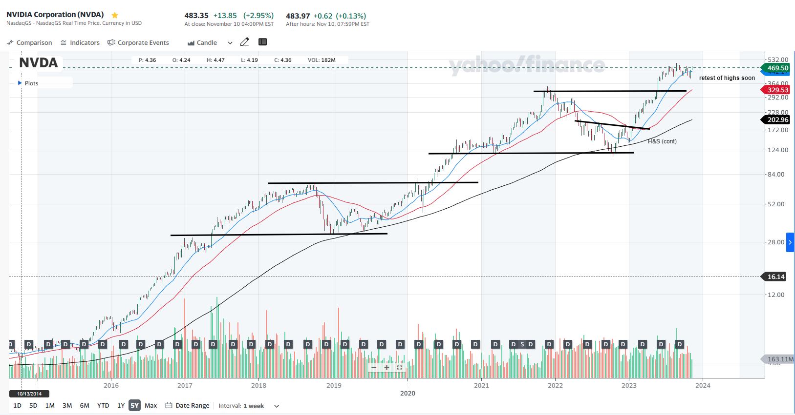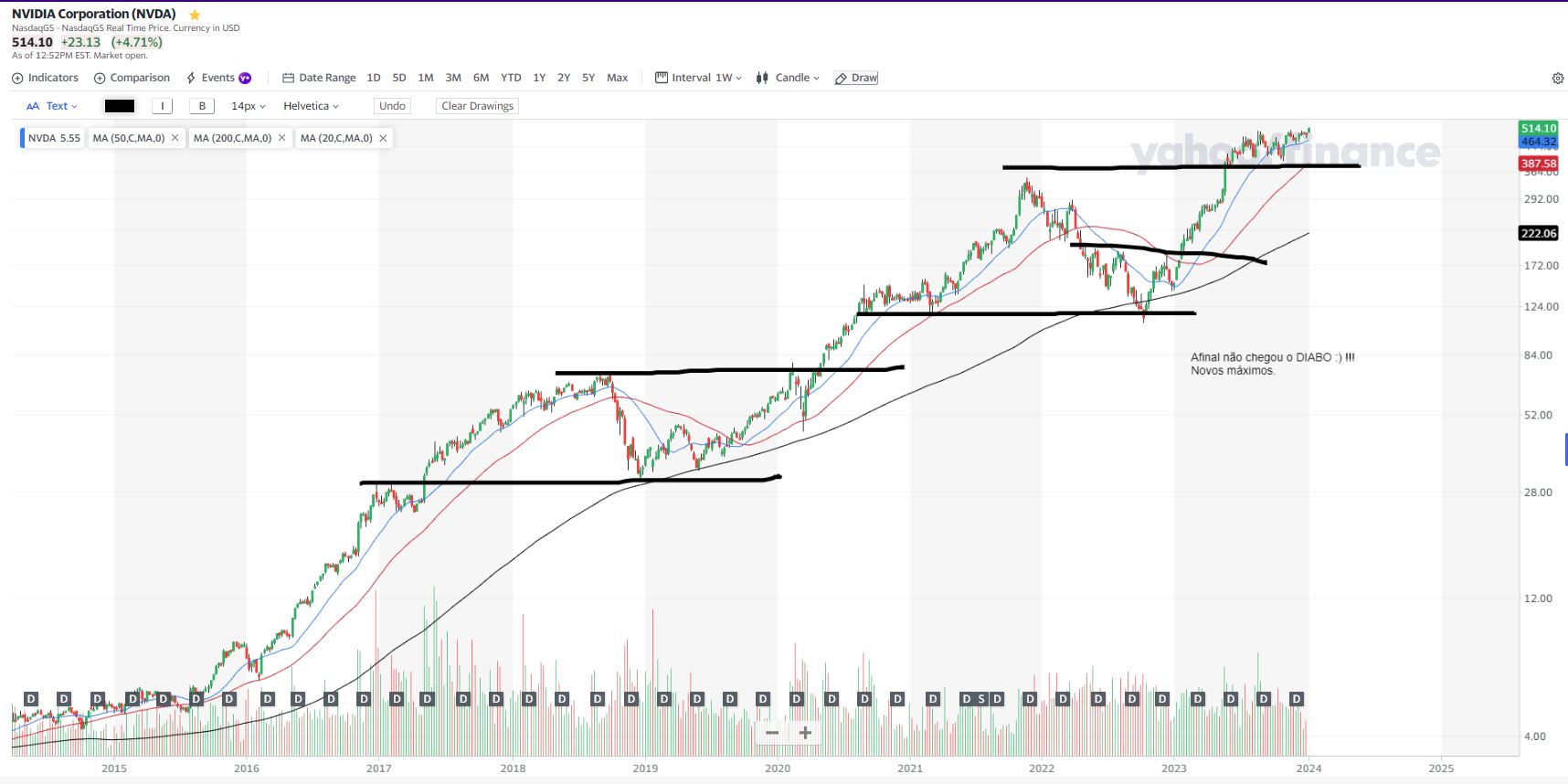 NVDA (semanal): até ver tudo se mantem mais ou menos na mesma, possível reteste de máximos em breve, mantendo-se as tendências (cp/mp/lp).