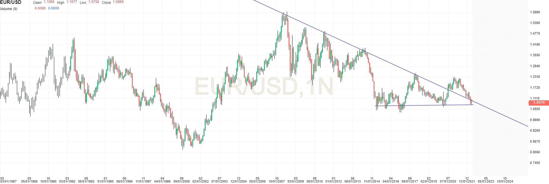 É o caso do EUR/USD nesta fase. Vejam que nem os mínimos de 2020 (crise C-19) serviram como suporte, mesmo com a AT a gritar "oversold"