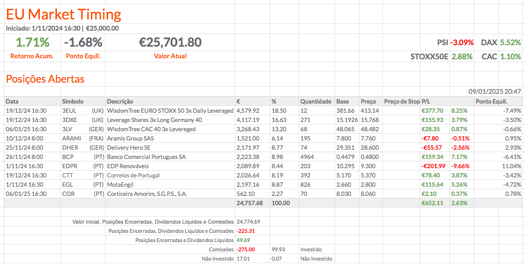 A carteira subiu 9,29% desde a última avaliação em 15/12/2024 (de -1,90% para 7,39%), ampliando a vantagem sobre o índice PSI para +7,97%.