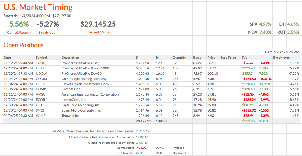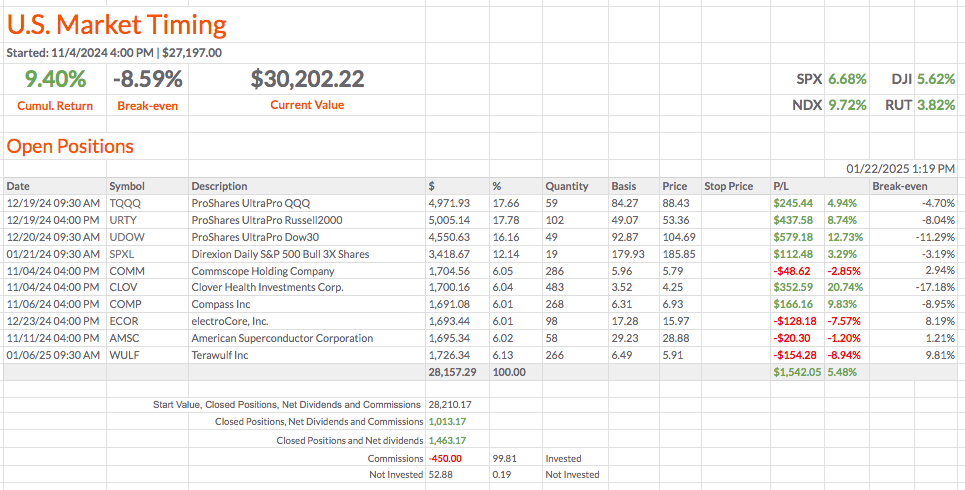 A carteira subiu 7,62% desde a última avaliação em 15/12/2024 (de -2,09% para +5,53%), ampliando a vantagem sobre o índice SPX de -8,01% para +0,56%.