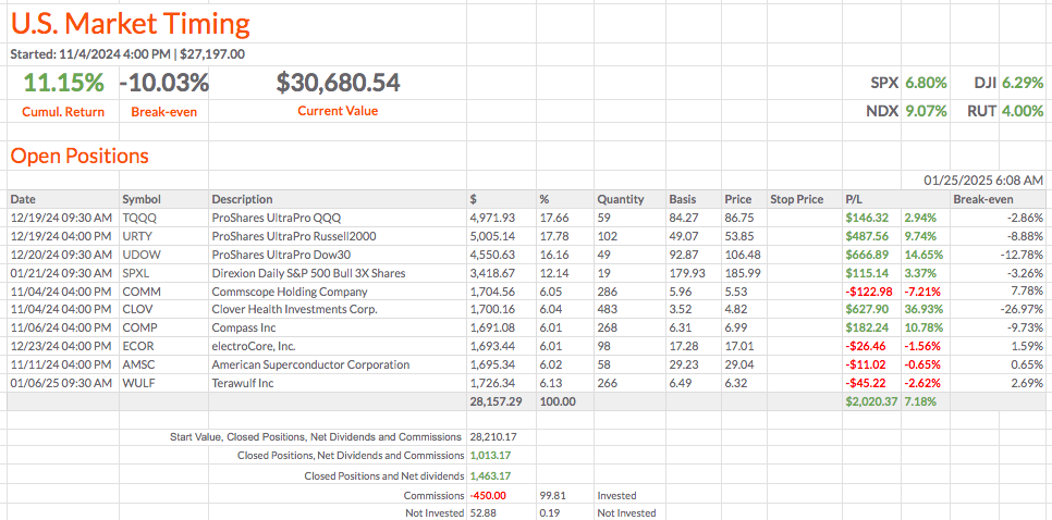 A carteira subiu 5.62% desde a última avaliação em 17/01/2025, de +5.53% para +11.15%, ampliando a vantagem sobre o índice SPX de +0.56% para +6.80%.