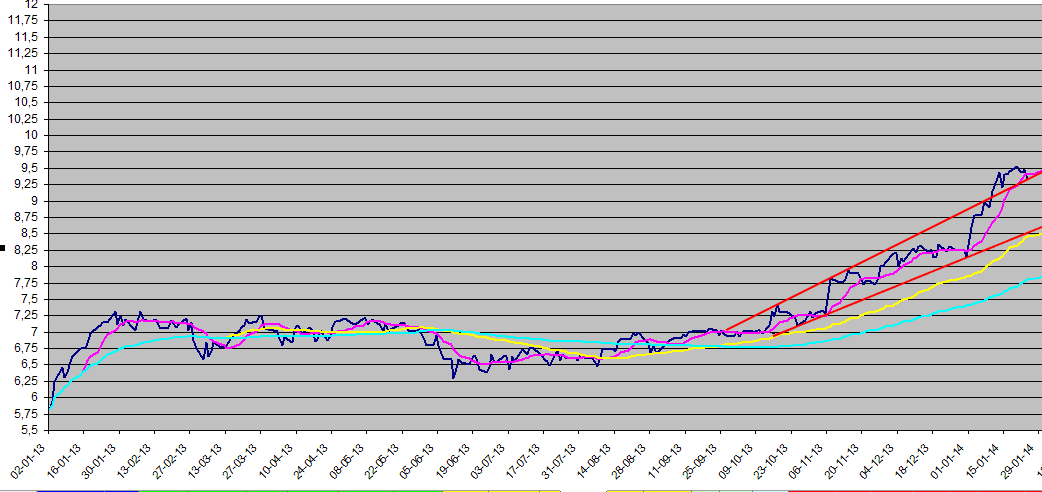 Após uma valorização de 25 % em Janeiro de 2013, a cotação lateralizou até finais de Setembro. Desde Setembro que a cotação vem num canal ascendente, levando desde essa data uma valorização de 45%. Nos últimos dias, e também porque o próprio PSI 20 terá contribuído para isso, assiste-se a uma retração que culminou com a passagem da linha da cotação da acção para debaixo da linha da média móvel de 10 dias. A longo prazo é de esperar que continue numa linha ascendente. No curto prazo acredito numa lateralização, ou até numa correcção até aos 8,25 €.