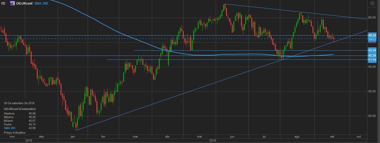 O brent tem andado entre os 45,50 e os 47,50.