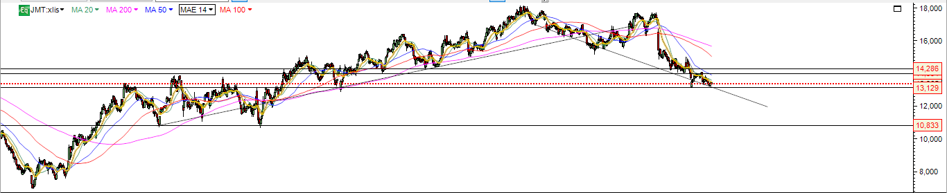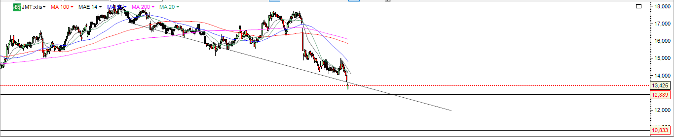 Apenas para esclarecer que a JM não quebrou nada, porque aquela linha ali traçada não existe em termos de análise técnica. Já tinha identificado há algum tempo os sinais de fraqueza na JM, mas tive que vir dizer isto porque quem não percebe nada de AT vê uma linha num gráfico a ser quebrada e até pode pensar que é relevante. E não é porque aquela linha é uma invenção.