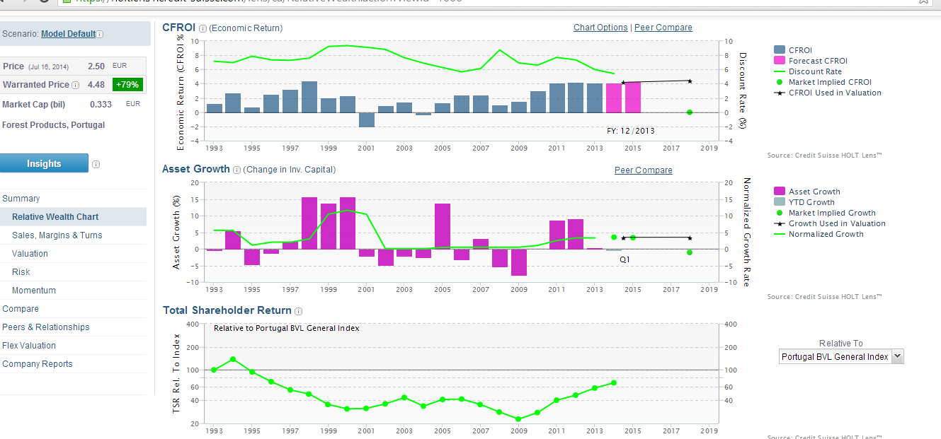 Se percebo bem os gráficos (bem interessantes, suponho que seja alguma funcionalidade paga do Credit Suisse), o ROI é realmente baixo o que implica que crescimento futuro se não trouxer consigo um aumento do retorno (o que é possível) pode ser destruidor de valor (mas a empresa felizmente tem distribuído grande parte dos lucros, guardando o resto para investimentos estratégicos como foi o da Trefinos que baixou o ROI mas eliminou concorrência).