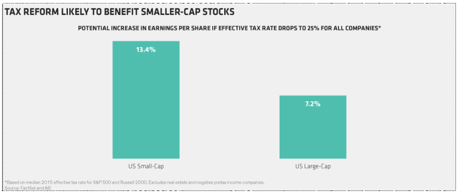 1. TAX REFORM: This is the most unambiguously positive proposal for small-caps and a big reason for the market rally. Smaller companies generally have higher tax rates than multinationals, so lower corporate taxes would provide a big boost. Some smaller companies that pay close to the full current corporate rate, such as regional banks and certain consumer and industrial companies, could see earnings rise by 10% to 20% if the rate falls into the 20%–25% range (ver gráfico acima).