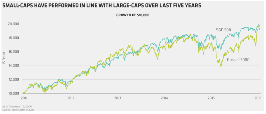 What’s going on? Investors are betting that a bevy of proposed Trump polices, including lower corporate taxes, repatriation of cash held offshore and looser regulation, and their likely effects (faster economic growth, higher interest rates, rising inflation), will disproportionately benefit small-cap stocks.