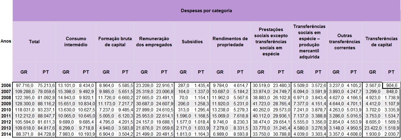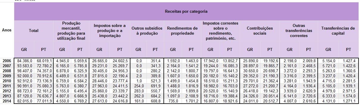 Comentários? Evolução das receitas e despesas das administrações publicas (valores em Milhões) de GR (grecia) e PT (portugal).