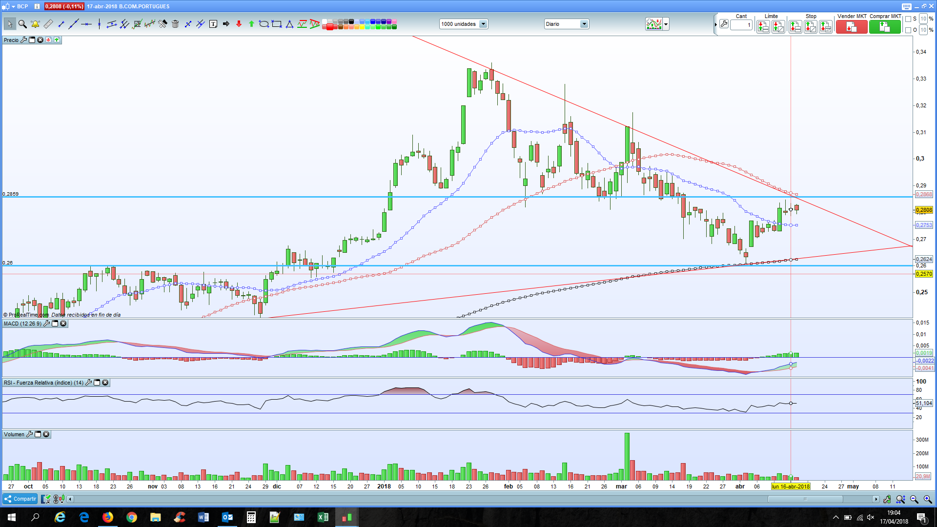 O que é de notar, é que apesar no SP500 já ir acima dos 2700, do DAX se aproximar dos 12600, um patarmar muito importante que limitou a recuperação em 26/02/2018, o PSI não está a vencer os 5500 e o BCP está a marinar junto aos 0.2810 com um volume extremamente baixo o que revela muita incerteza.