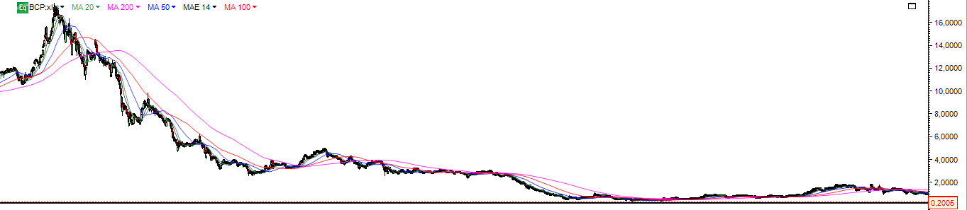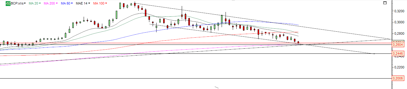 Agora enquanto ele afirmava o risonho futuro do BCP quando estava acima dos 0.30, já era visível a vinda á MM200 , LTA e 0.26.
