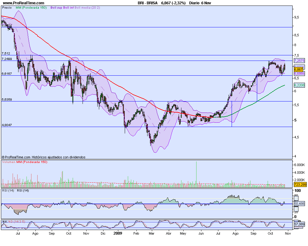 Deixo aqui a minha visão da Brisa. Acho que está tecnicamente muito aptecivel para comprar. Entrei à +/- 2 semanas a 7.15 porque não dei atenção aos sinais. O MACD e o Estocástico a avisarem para não entrar, mas não quiz ver o óbvio.