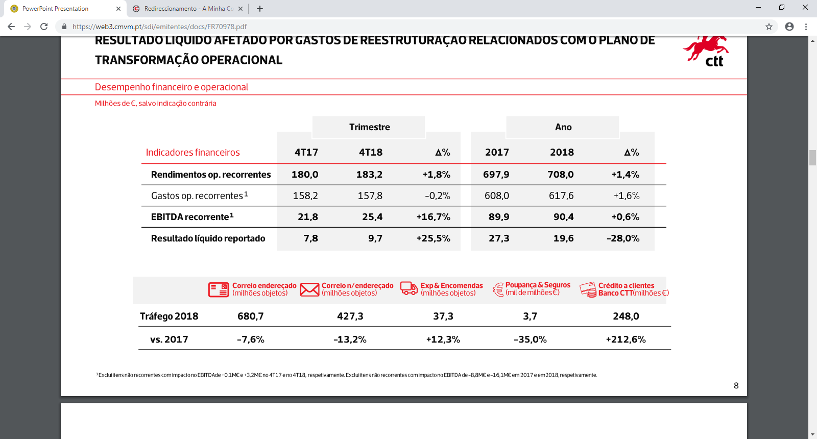 sinceramente foi pessimo, para o ano a anacom ja nao permite mais subir os preços 4%, e se é verdade que a 321 credito atenua vai sair da empresa ctt para o banco os poucos cp que restam, a meu ver pode servir para especular... como investimento de lp os ctt estão riscados claramente. Pensem nisto os a medida que os correio cai todos os anos veem custos nao recorrentes de despedir carteiros que afinal são recorrentes.... e o que acho dos ctt acho de muito operador postal que por ai anda noutros paises... a diferença é o per que nos ctt é um disparate face a uma bpost.
