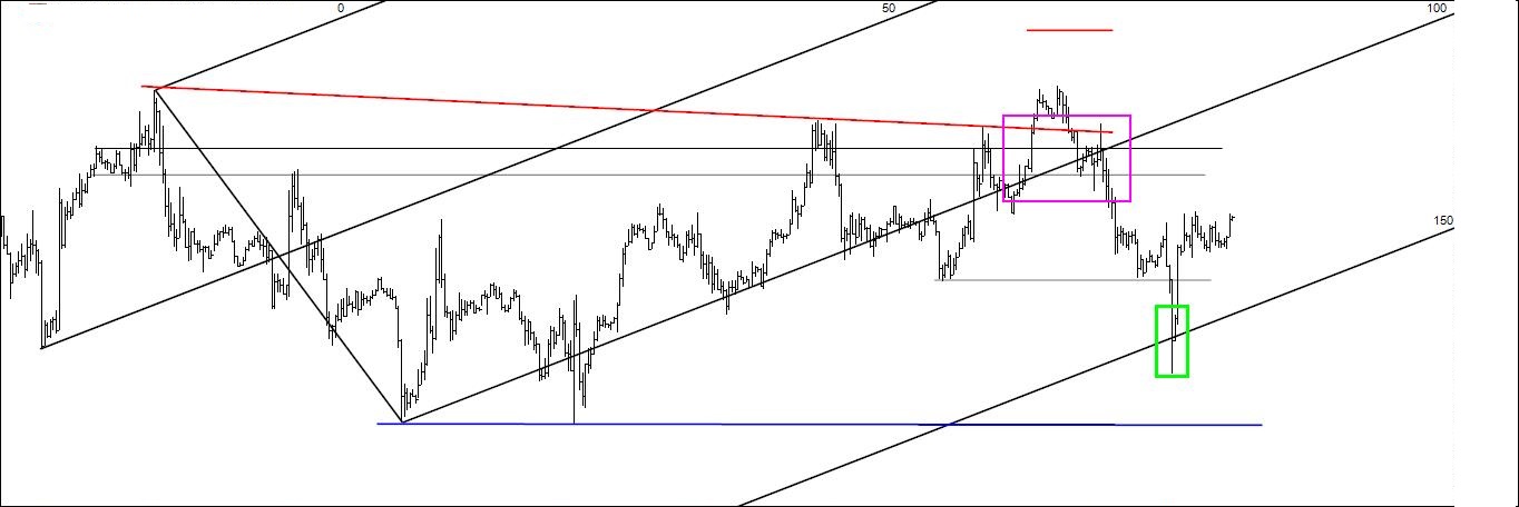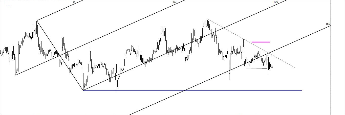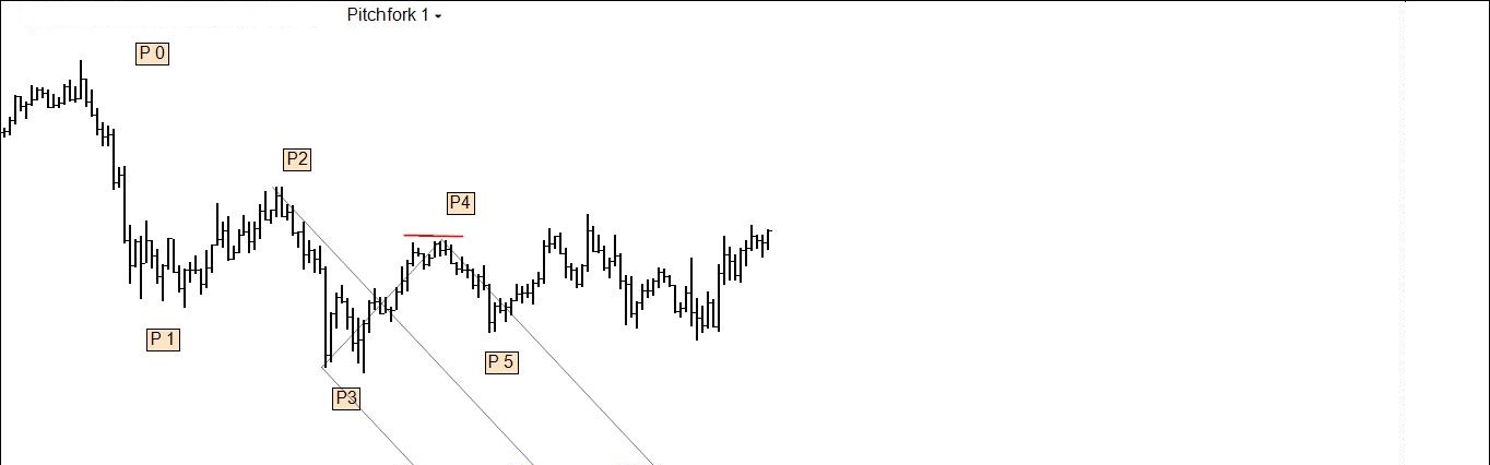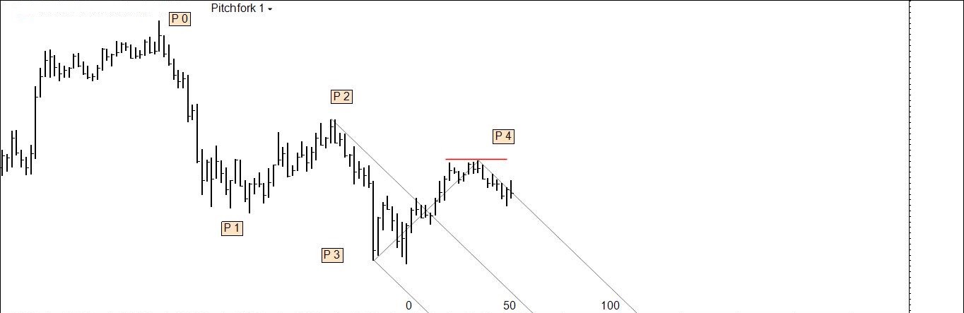 Primeiro tracei a linha de pivots que defini como sendo a ML, seguidamente tracei a paralela Reaction Line (RL) por pivots que me pareceram relevantes, e por último a Action Line (AL) na mesma distância à ML. Notei que o preço nãp atingiu a AL no máximo absoluto, significando fraqueza... Será válida esta consideração?
