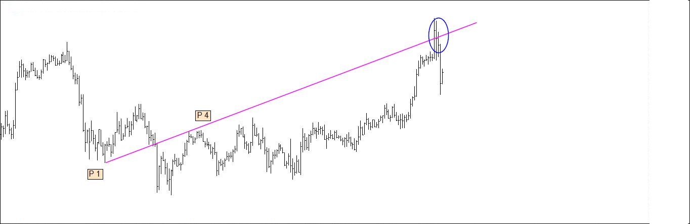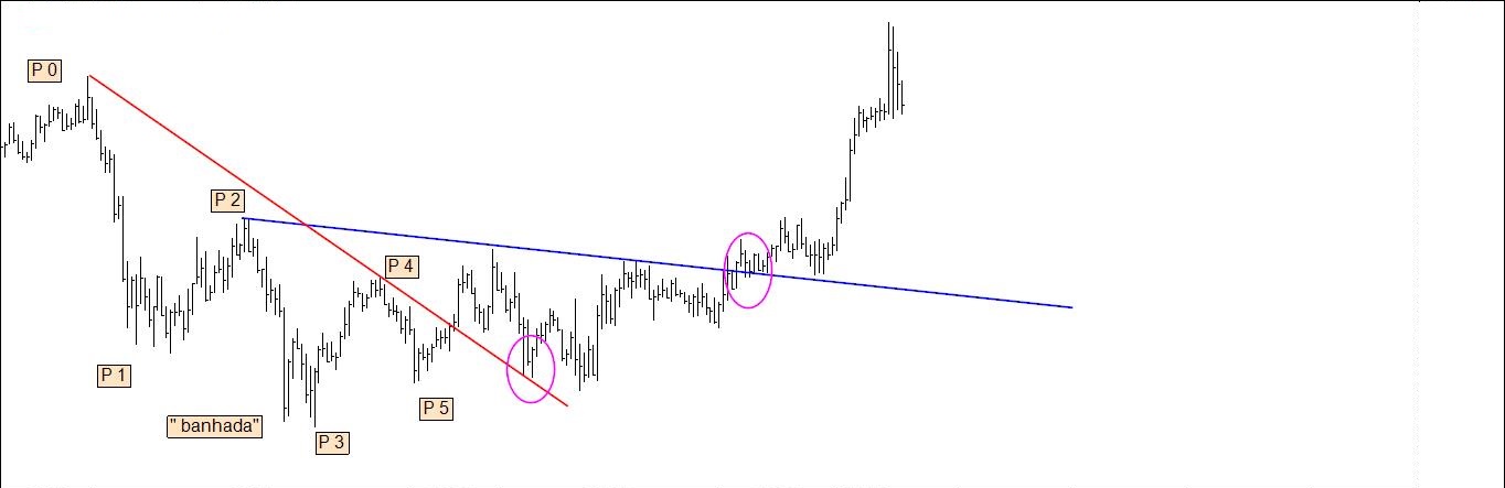 Gráfico 1: linha P 0 - P 4 serviu de motivo para a compra (nas lições podem ser encontrados o fundamento e as características desta linha). O target será, no mínimo, o anterior máximo (correspondente ao P 0), sendo certo que esta técnica se destina a apanhar o início da reversão e, por isso, o início de um novo swing. Estão identificados 2 possíveis locais compradores. A banhada ou "João Moura" conferem protecção para a stoploss.