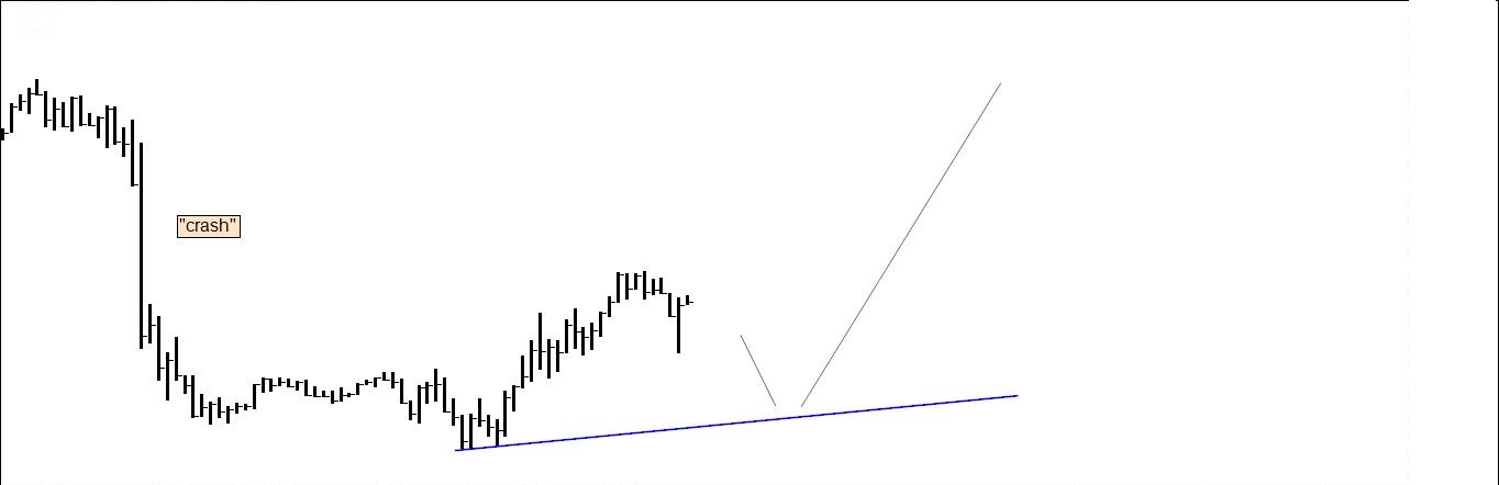 Voltando à técnica sugerida pel´A Voz (técnica "uma só linha"): vou comprar na linha azul, com stoploss abaixo do último low e target no anterior máximo. Fazendo rapidamente as contas nas costas de um envelope, suspeito que a ordem de compra será executada até ao fim desta semana e o target será atingido na próxima semana. Fundamento técnico: There is a high probability that: