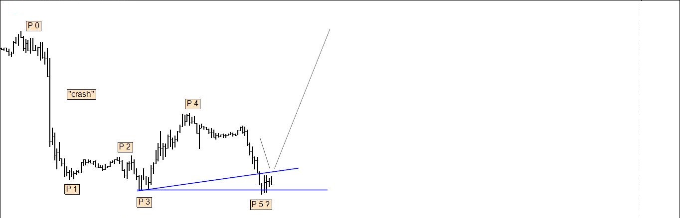 O Alquimista Escreveu:Gráfico 1: usando a contagem dos pivots segundo o Prof. Anderson (já expliquei lá para trás e está no site). A ideia é aguardar a formação do pivot 5 para se efectuar uma compra (note-se que não tem de ser o pivot 5, pode ser o pivot 7, é uma mera regra e quem quiser ficar agarrado a regras sofrerá na pele as excepções). Formado o pivot, vai-se à procura do local para a stoploss. Só de seguida é que se põe o dinheiro em risco. Como não há pressa, de momento só acompanhando.