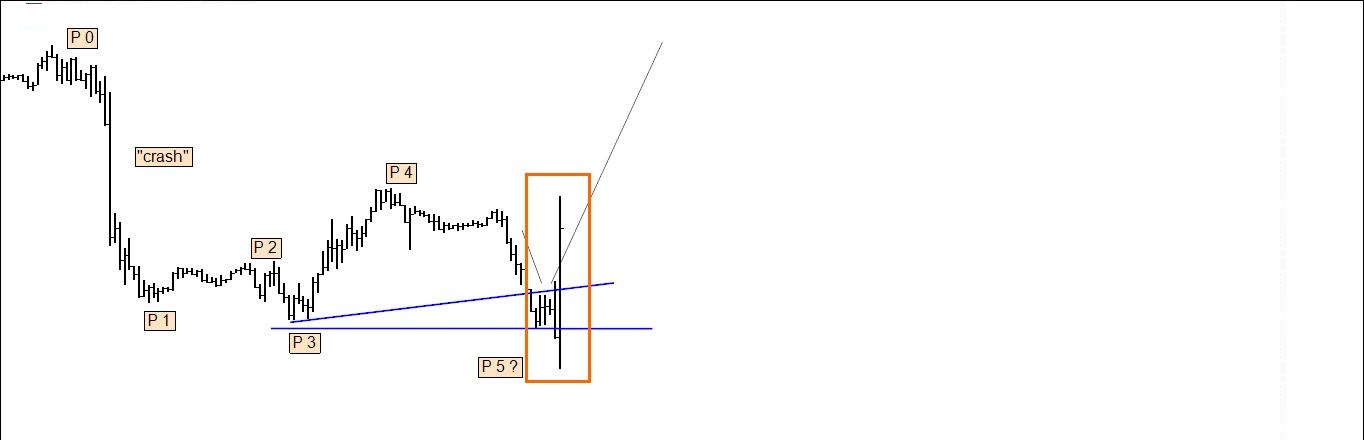 A formação do P5 no local assinalado ("falha do P 5") permite retirar boas conclusões quanto à intenção do mercado. Acompanhando e aguardando que me dê um bom lugar para a colocação da stoploss, de preferência fazendo um "João Moura". Eu quero ver excitação e dor no mercado, num sentido ou noutro, qual tubarão à procura de sangue fresco.