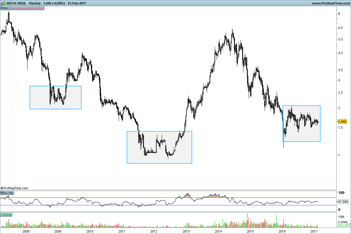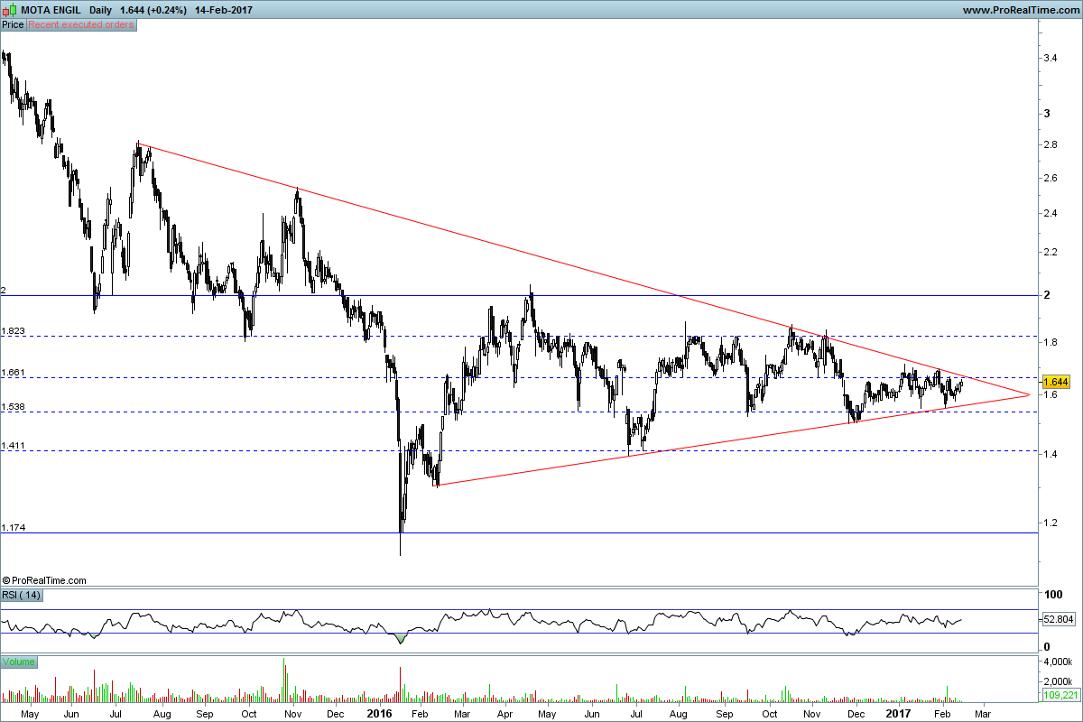Numa altura que o PSI se encontra próximo do primeiro patamar importante para os longos - 4.750 - apanhei a Mota Engil (empresa e sector que não aprecio particularmente), encontra-se numa fase de consolidação num range a afunilar. Parece-me interessante uma vez que as zonas estão bem definidas e as longas consolidações antecipam movimentos fortes e prolongados no tempo. Resta saber se de continuação ou inversão..