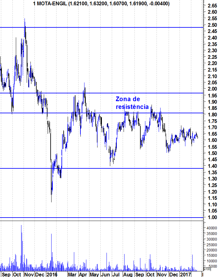 A Mota testou hoje o topo do triângulo e a resistência de 1,70, fazendo o volume médio diário na primeira hora de negociação.