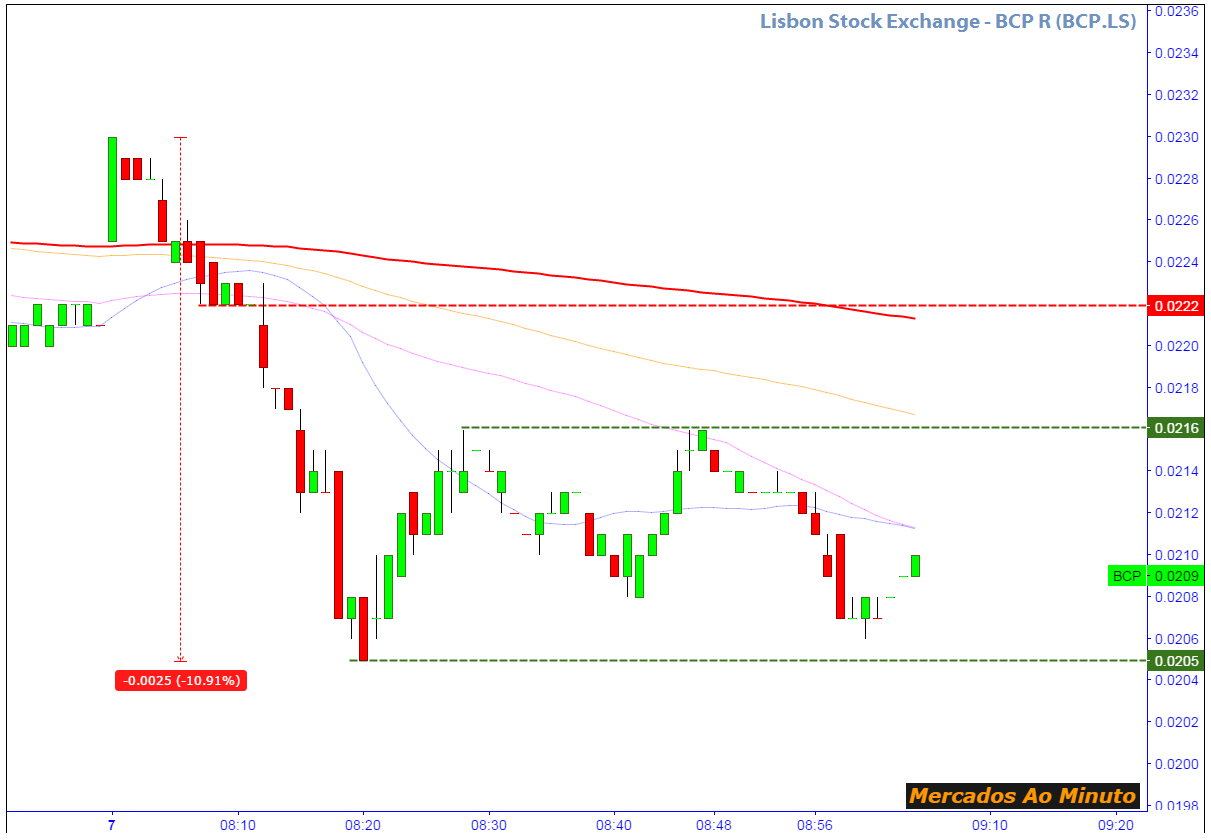Em 20 minuto as acções do BCP caíram de 0,0230 para 0,0205 cêntimos, quase 11% de desvalorização.