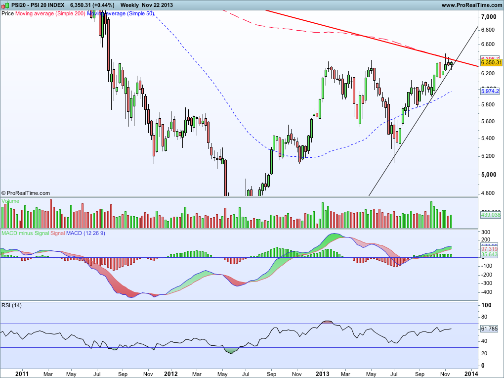 grafico PSI dos ultimos dois anos o indice tem respeitado uma barreira dos 5700 6400 com quebra em baixa em Maio de 2013 mas que encontrou suporte numa provável LTA que se pode vir a formar com o minimo de Agosto de 2012 e segundo toque Agosto de 2013, faltando um terceiro para validar a linha.